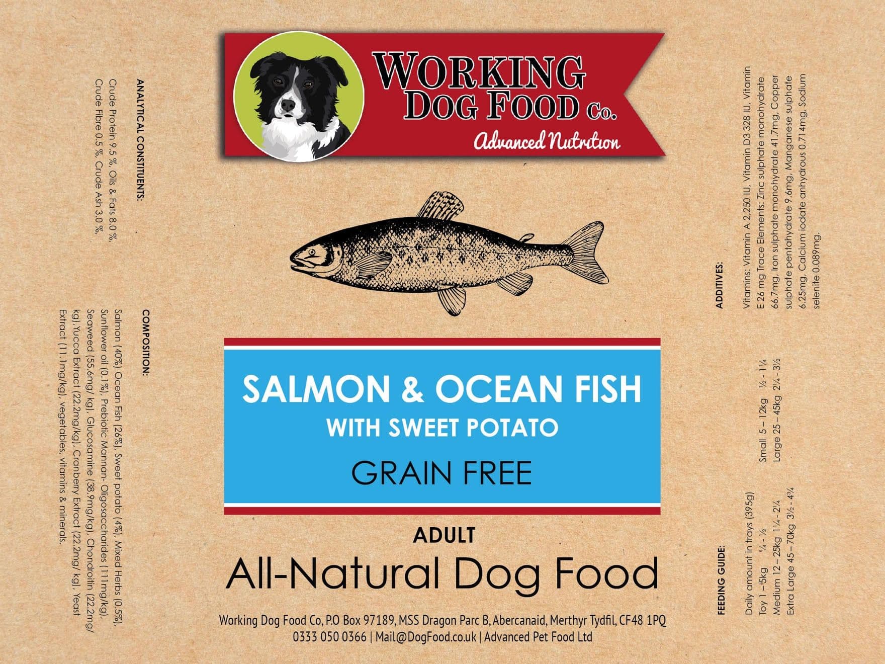 Salmon (40%) Ocean Fish (26%), Sweet potato (4%), MixedHerbs (0.5%), Sunflower oil (0.1%), Prebiotic Mannan-Oligosaccharides (111mg/kg), Seaweed (55.6mg/kg), Glucosamine (38.9mg/kg), Chondroitin(22.2mg/kg),Yucca Extract (22.2mg/kg), Cranberry Extract (22.2mg/kg), Yeast Extract (11.1mg/kg), vegetables, vitamins &minerals.